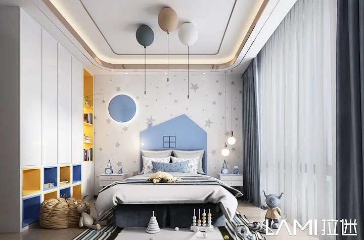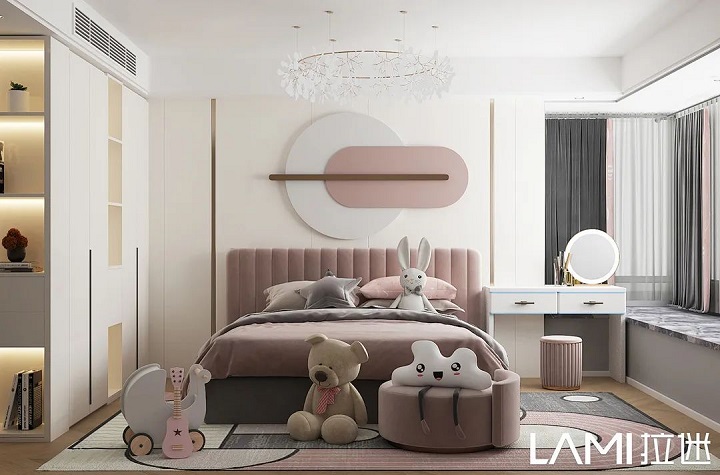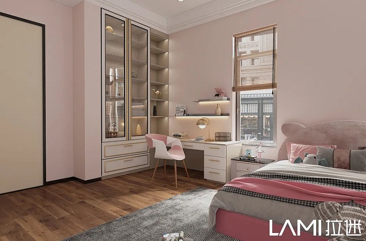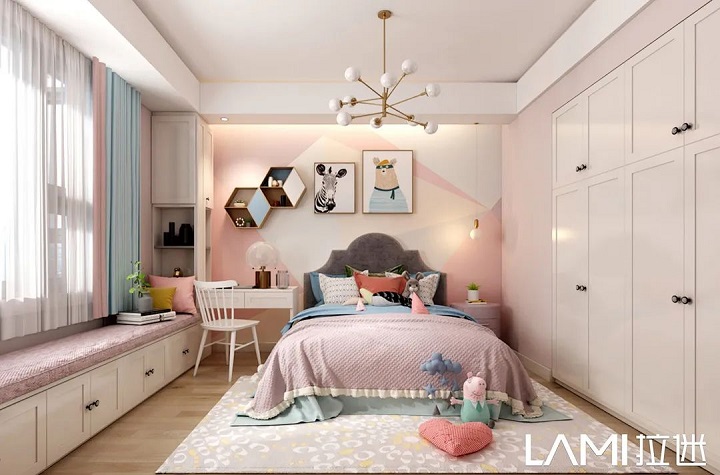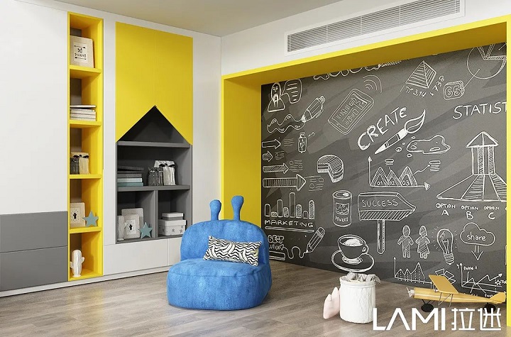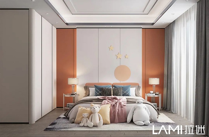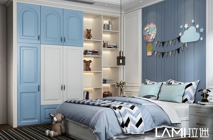 兒童房色彩搭配,拉迷一般采用幾款最接近大自然的板材:佩羅柏木、布格拉灰、伊麗莎白、絨面水藍(lán)等,色彩明亮、自然,對孩子的視力可以起到舒緩、放松。