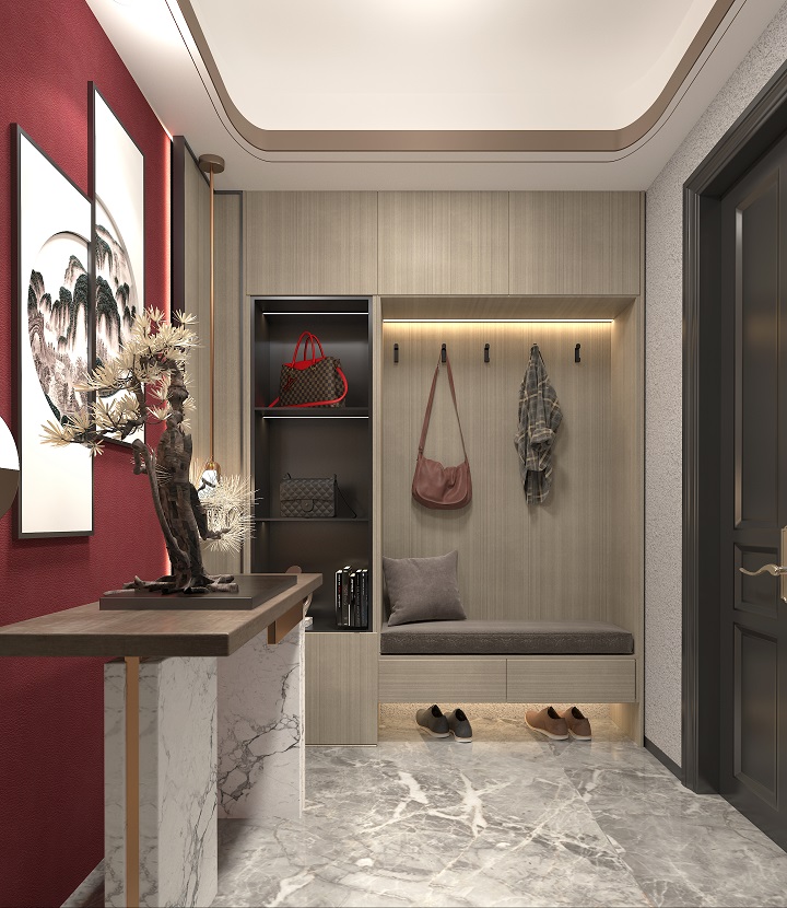 玄關可以用于接待客人,還能用于換衣、換鞋、擱包等,玄關鞋柜也是最為常見的家具。