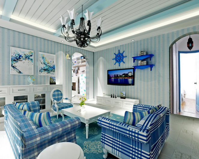 提到地中海風格的居室,立馬就想到了蔚藍的天空,所以地中海風格裝修也主要以藍色調為主,既然無法置身于微風徐徐的海邊,那么擁有這樣一間地中海風格的客廳也不錯。