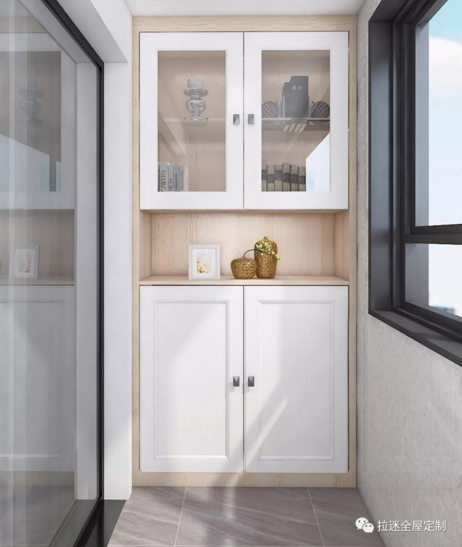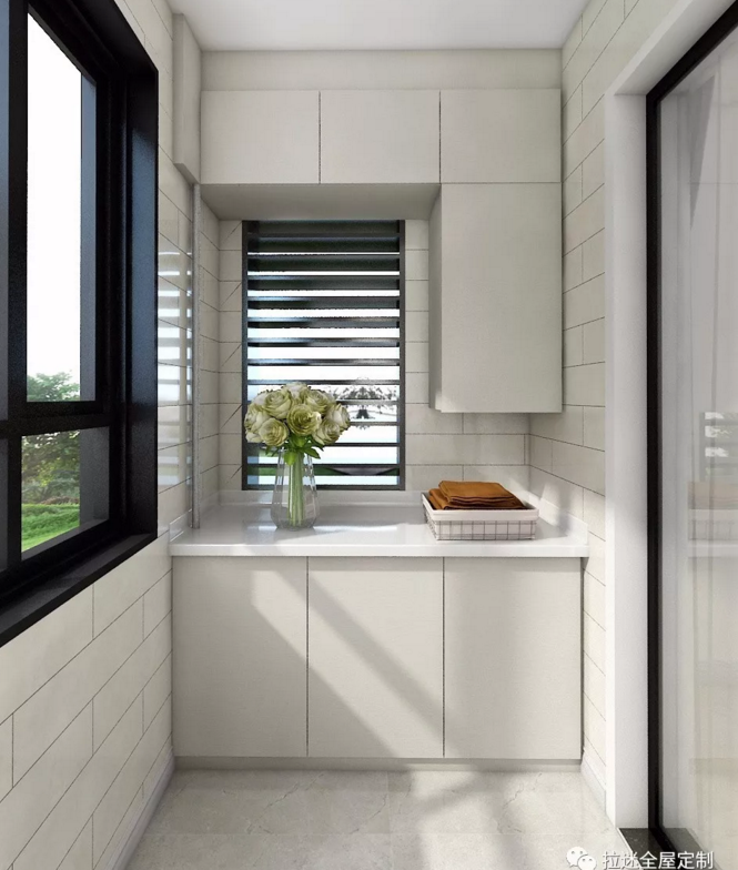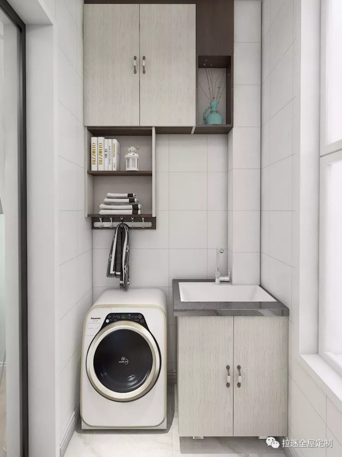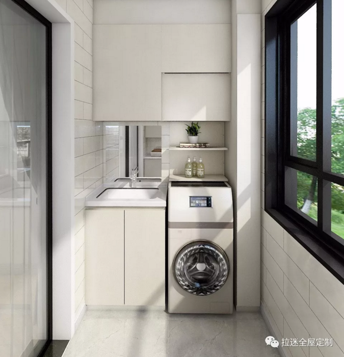 除了安放洗衣機和洗手盤,把陽臺變成一個洗衣房和洗漱區(qū)之外,陽臺的另一個作用就是安裝收納柜。