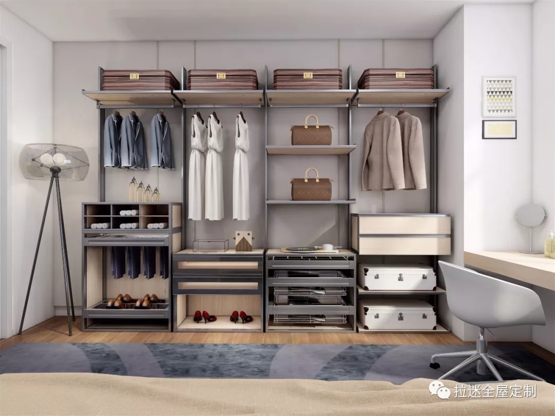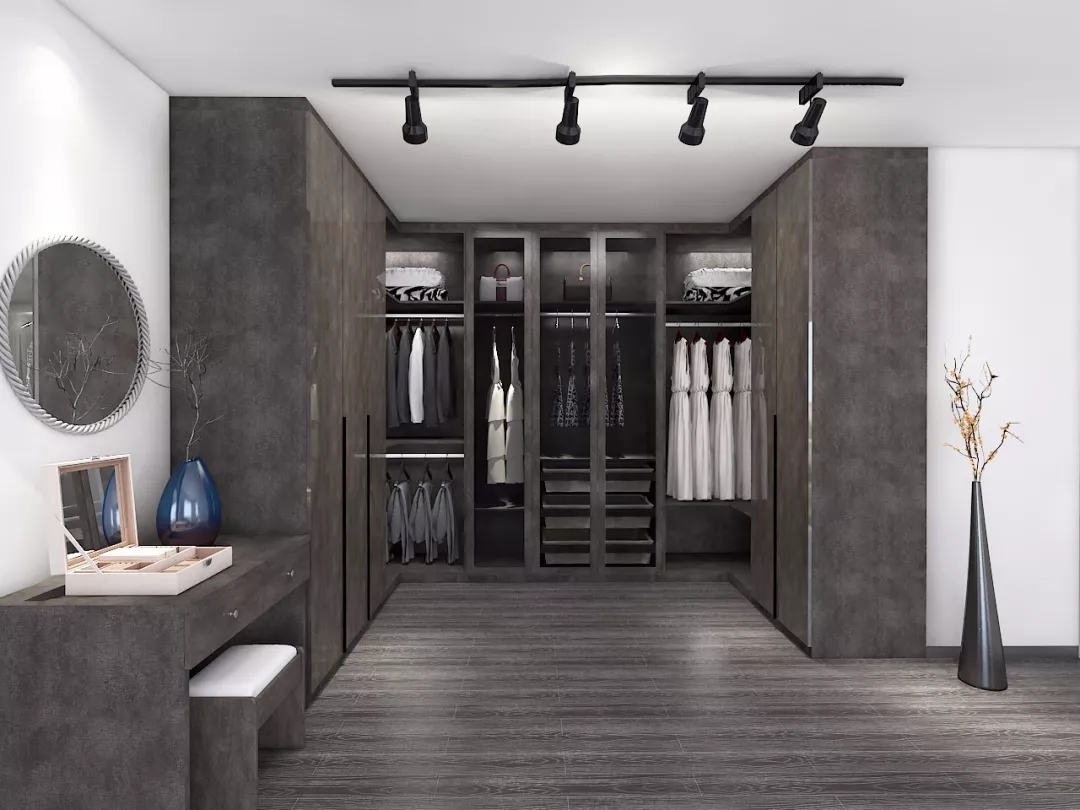 深色系衣服居多,衣柜內部用淺色襯托,如果淺色衣服居多的則用暗色系底材,根據多數衣物的顏色來選擇柜體內部底材的顏色,色彩強烈的對比可以將繁多的衣物更鮮亮地襯托出來。