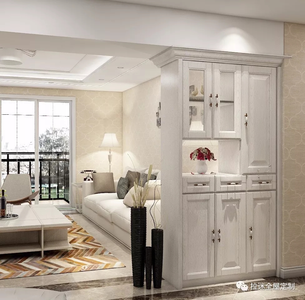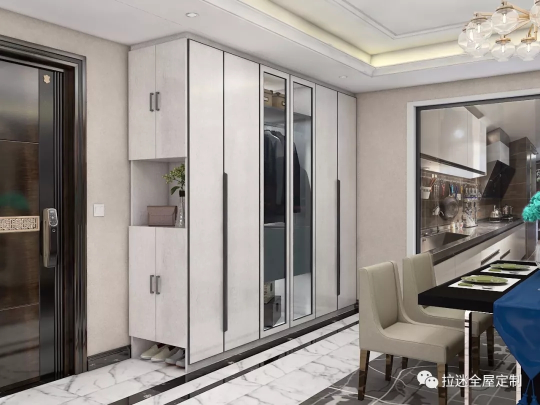 如果入門正對(duì)客餐廳,可在門前1.5m~2m處設(shè)置玄關(guān)柜,最大程度保證隱私,避免一覽無余的尷尬。
