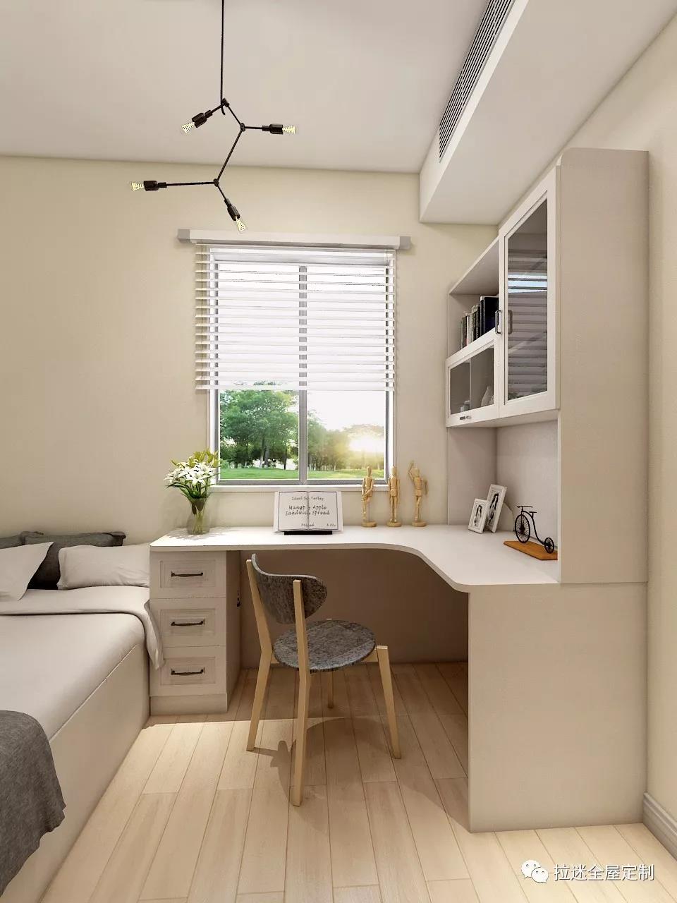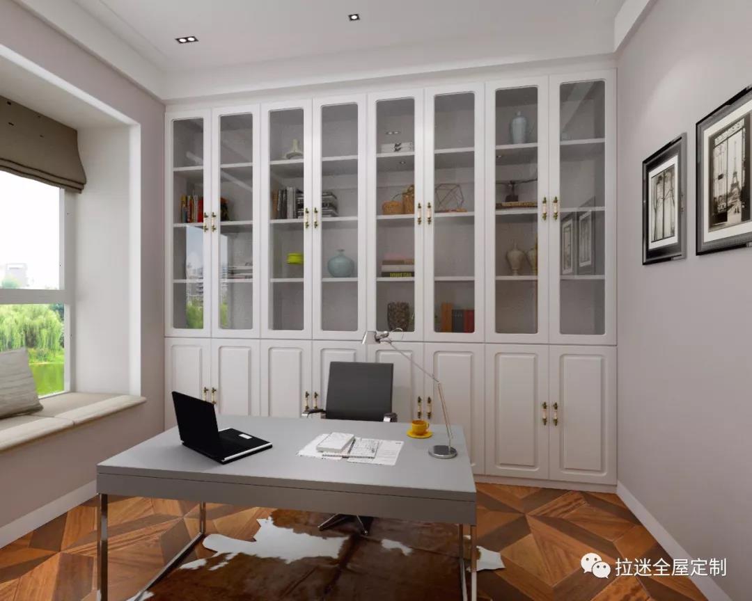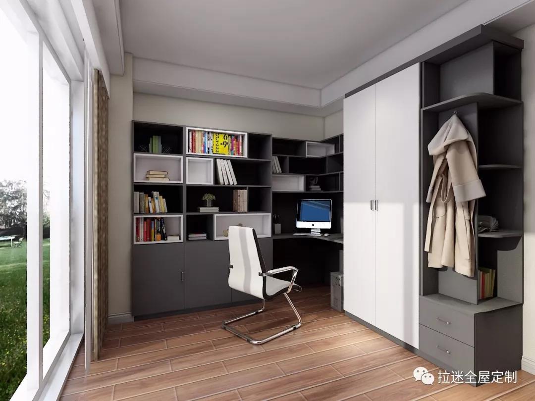 一般的定制書桌柜,多以轉角式構成“L”型,充分利用轉角位空間,為書柜增添辦公區。