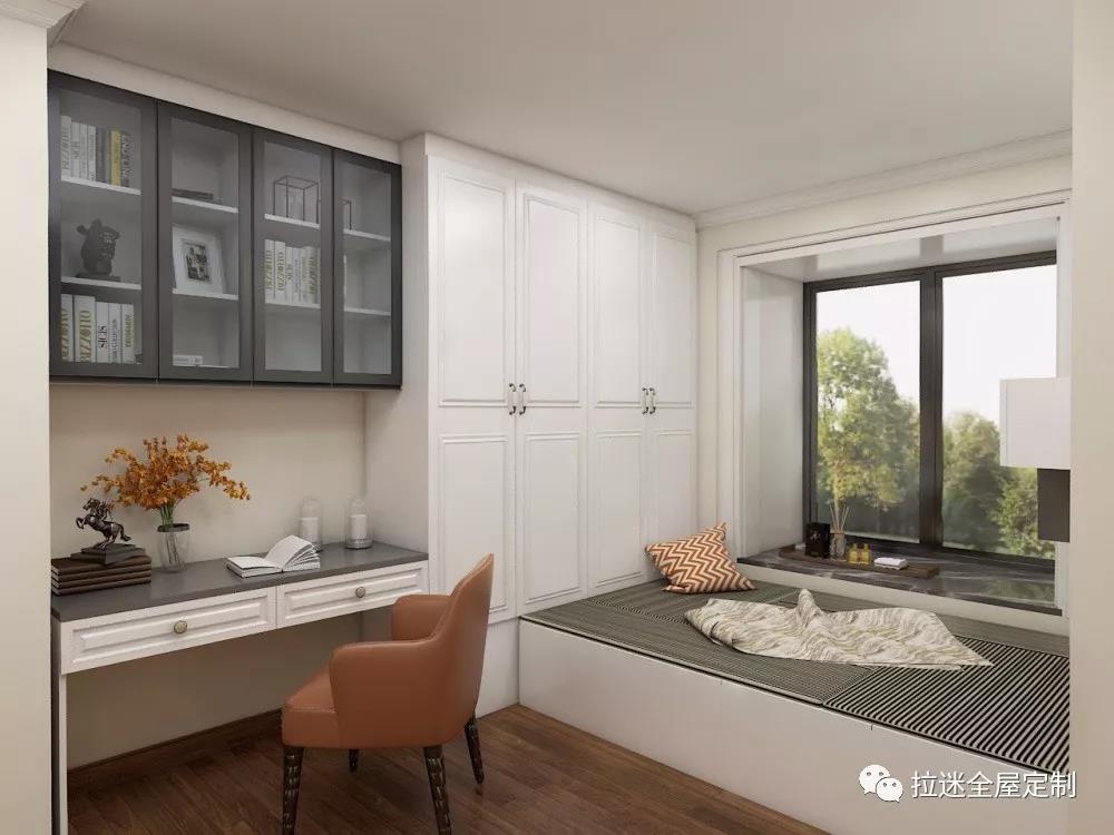 如果安裝榻榻米的這間臥室,主要功能是書(shū)房或者書(shū)比較多的話,可以在榻榻米床的周圍設(shè)計(jì)收納書(shū)柜,如果床的長(zhǎng)度不夠,設(shè)計(jì)成吊柜也不錯(cuò)。