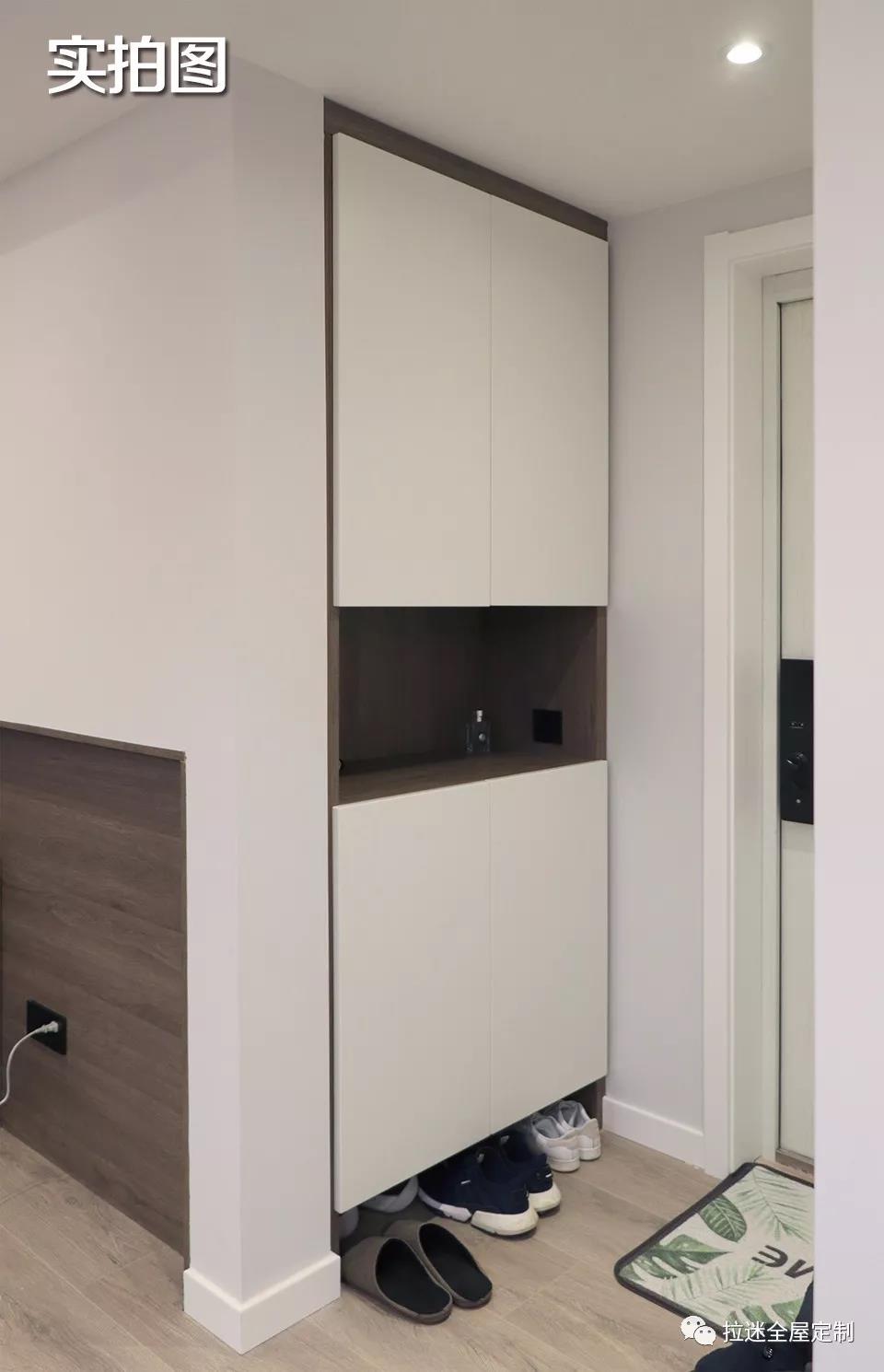 做了一個與玄關柜類似的簡易儲物柜。上下兩個柜體放置一些雜物,不讓空間有絲毫的浪費。