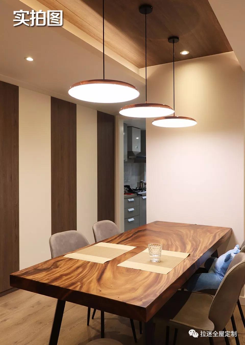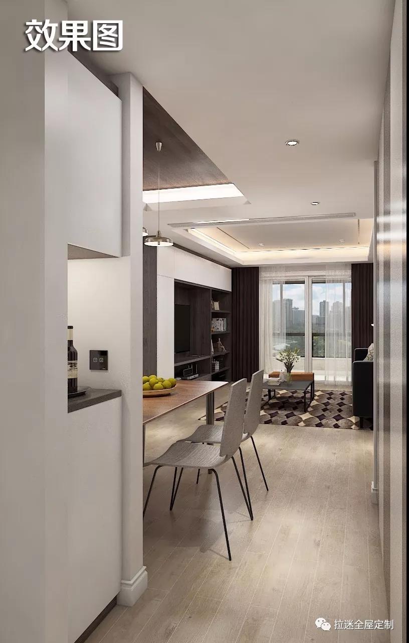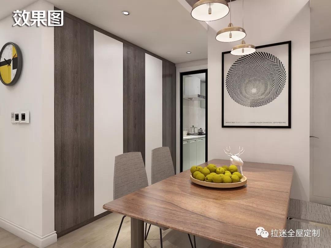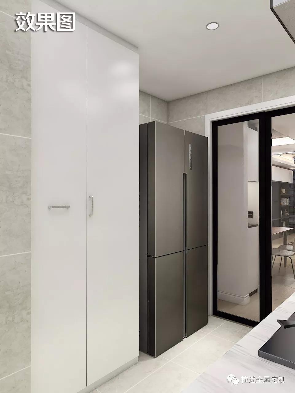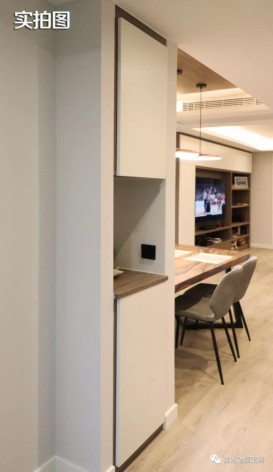 因為之前對戶型布局進行了一些改動,所以餐廳與廚房相連的地方有一塊多余的空間,這時候輪到拉迷定制家具出馬,