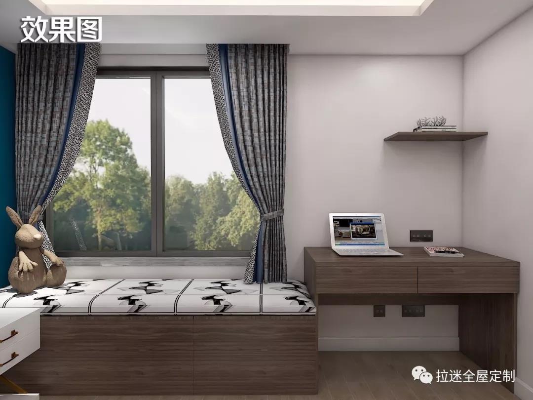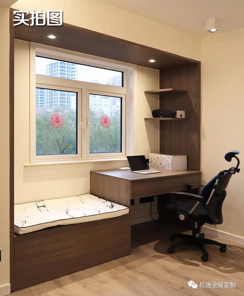 平時寫作業(yè),父母還可以在一旁的飄窗柜上陪著孩子。這樣的設計,讓這間屋子至少十年內不用再做改動。