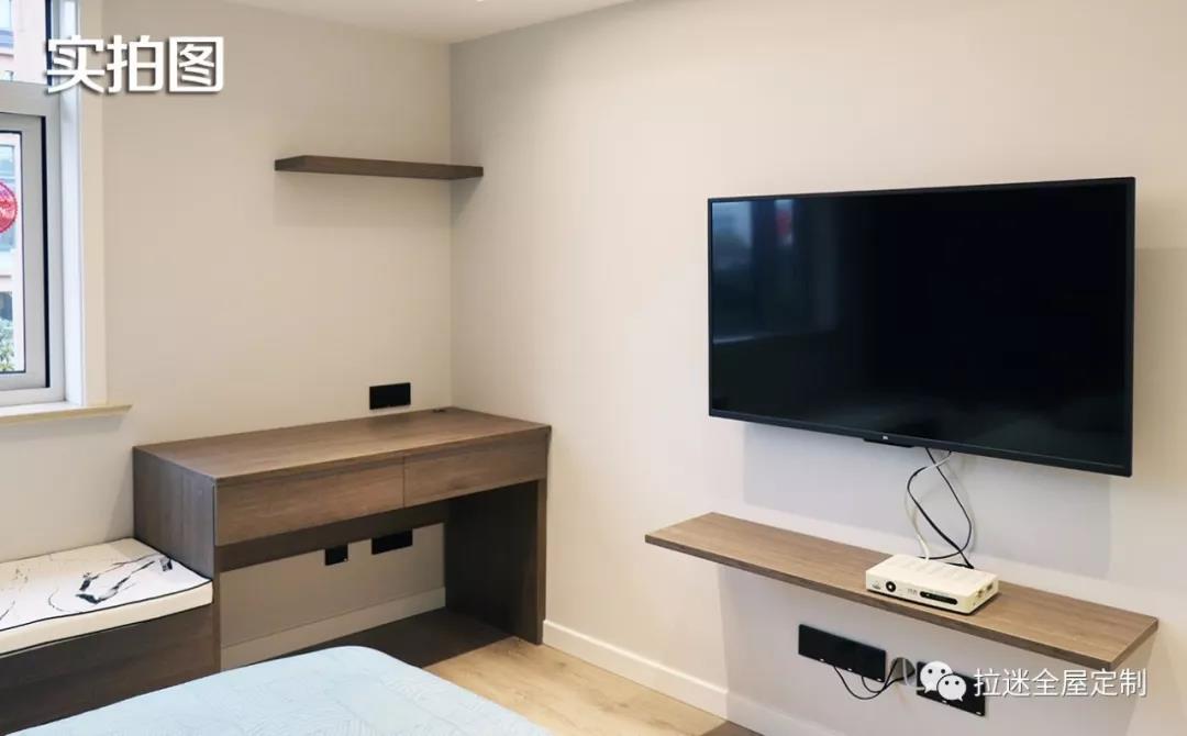 在次臥,也設計了一個書桌+飄窗柜。使得這間屋子近兩年可以作為書房使用。等到王先生有了孩子,這里又可以變?yōu)楹⒆拥呐P室,