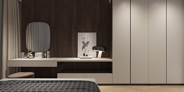 次臥主要柜體是一個沙漠灰的頂天立地衣柜,