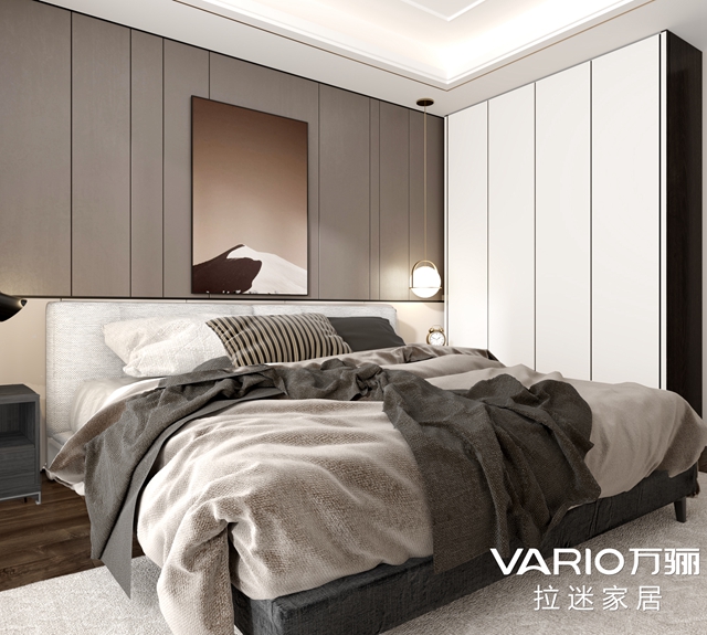 主臥要的就是簡潔大氣,一柜到頂不拼接,同色系背景墻點綴以金屬線條,溫馨中不乏時尚