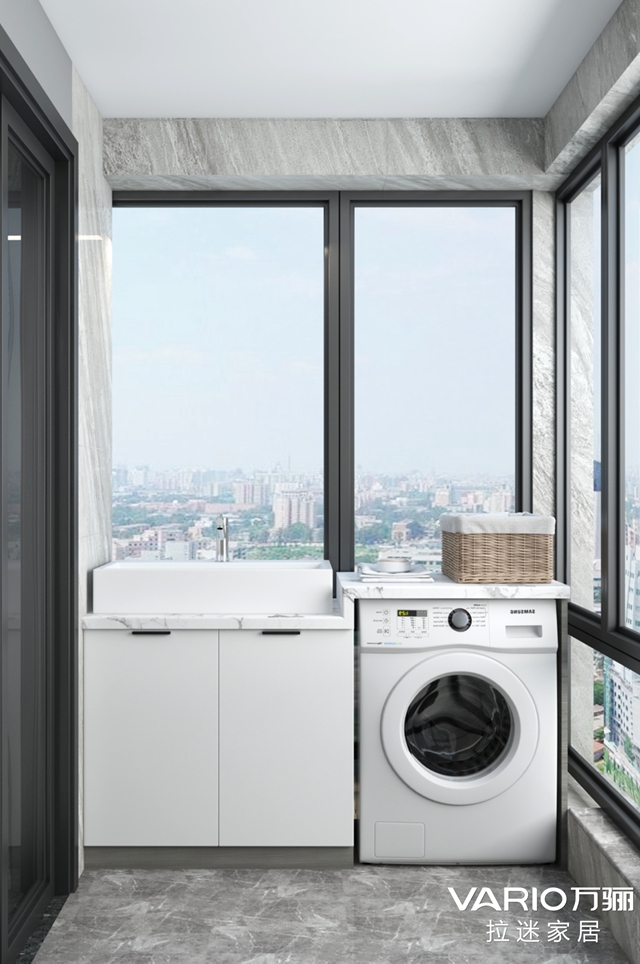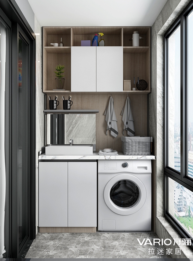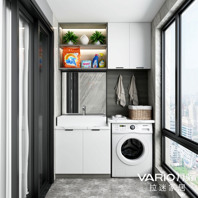 加上吊柜設計可以裝進常用的洗衣液、洗衣粉、肥皂、刷子等小物品,干凈又整潔。