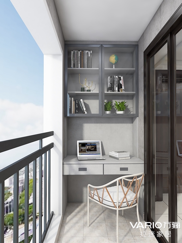 陽臺是空間的延伸之地,定制一款書柜,半開放的設計搭配玻璃門,讓你在選取物品時一目了然。